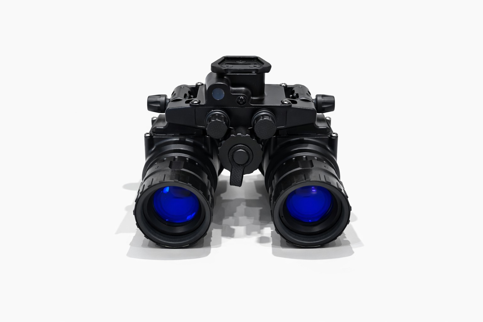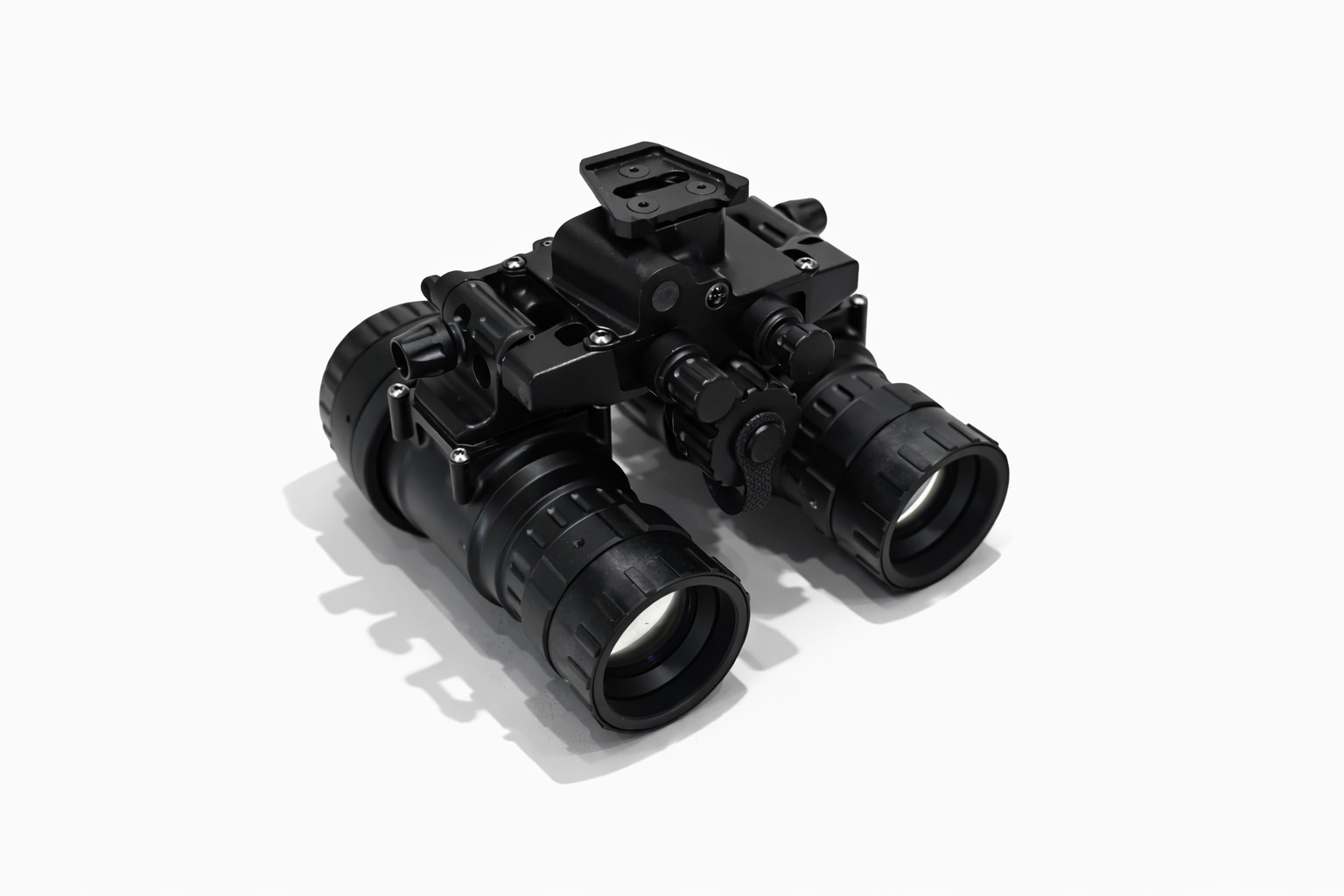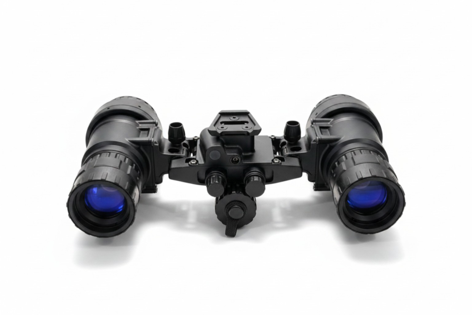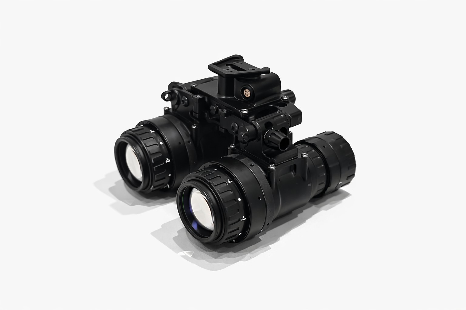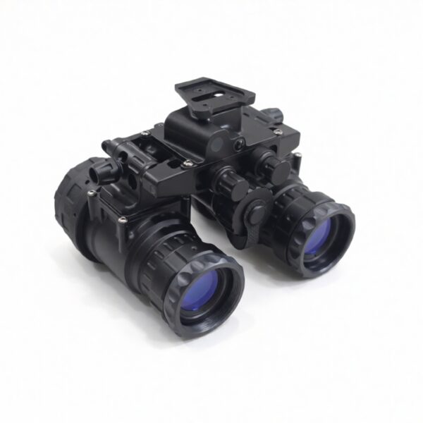 The Nighthawk-MG is a tough, feature packed device built to perform in harsh conditions. The housing is precision machined from 7075-T6 aircraft grade aluminum, ensuring durability in demanding environments. The binocular includes rotary controls for power and IR illuminator, along with a secondary dial for manual gain (brightness) adjustment of the image intensifier tubes. It operates on a single onboard CR123 battery or can utilize an external power source connected via a 4-pin LEMO-style plug. The binocular also features an interpupillary adjustment to fit a range of users comfortably. Its articulating design allows the optical pods to fold flat against the helmet when in the stowed position, reducing neck strain and protecting both the device and the user from potential impacts.