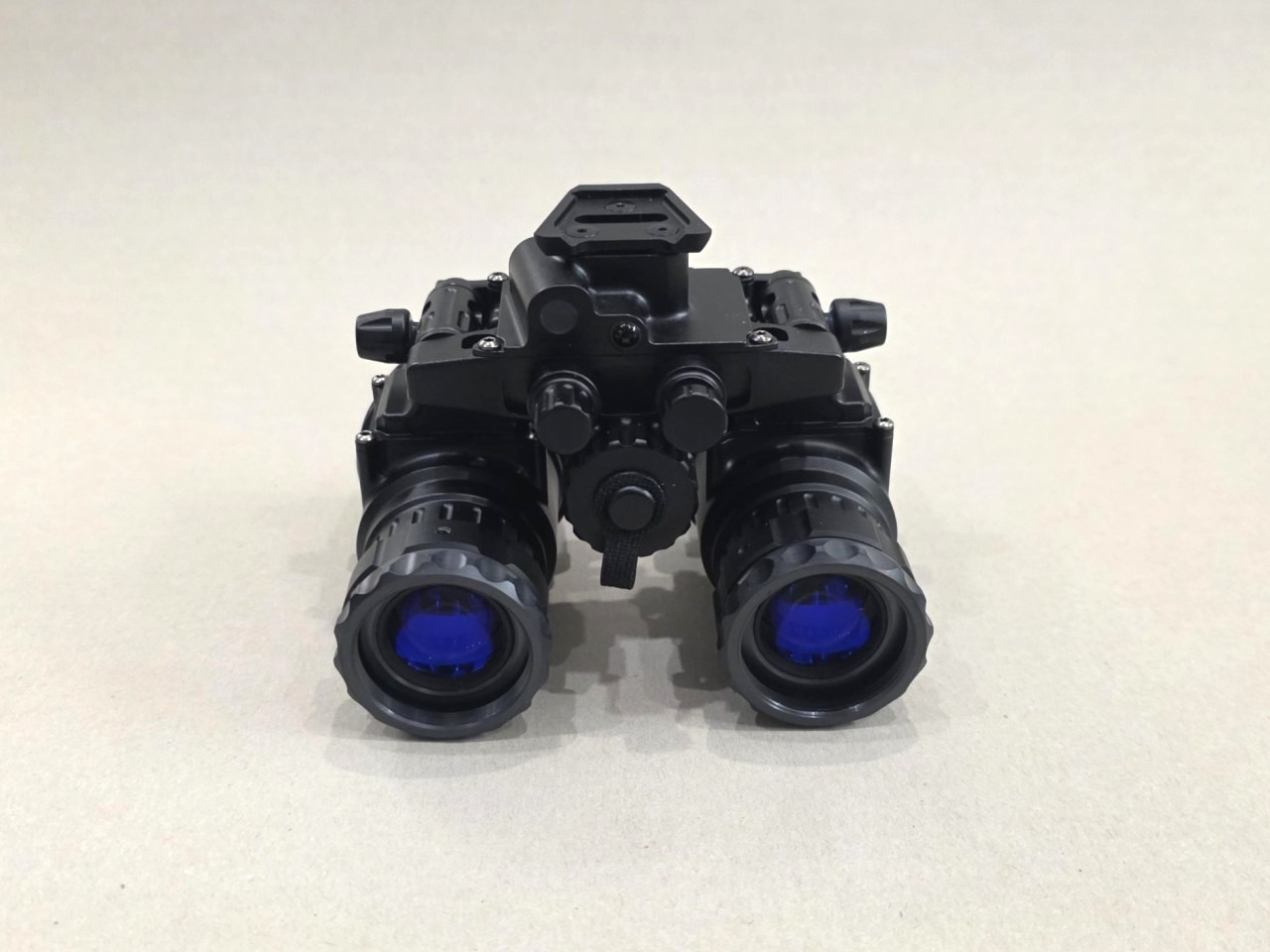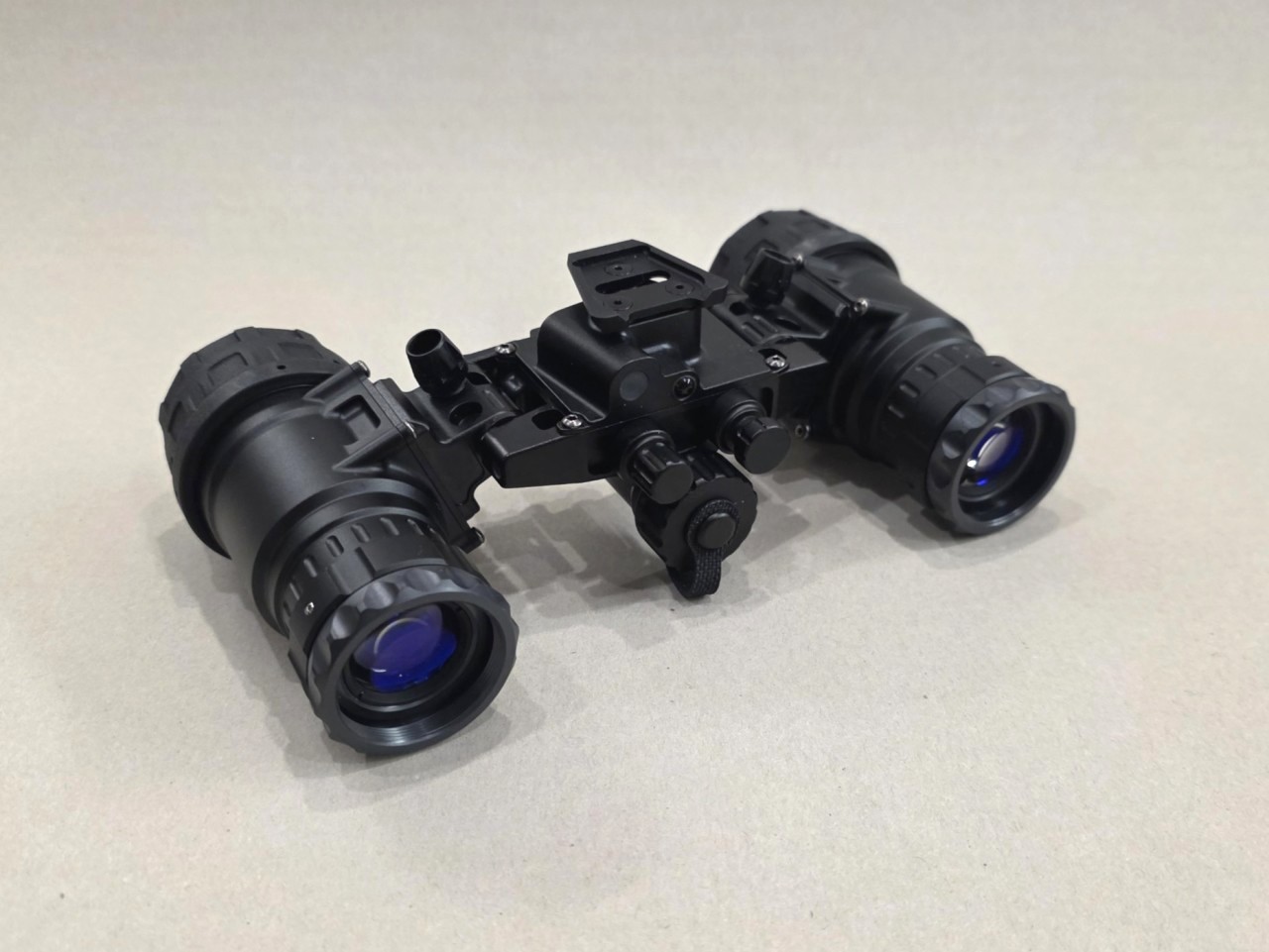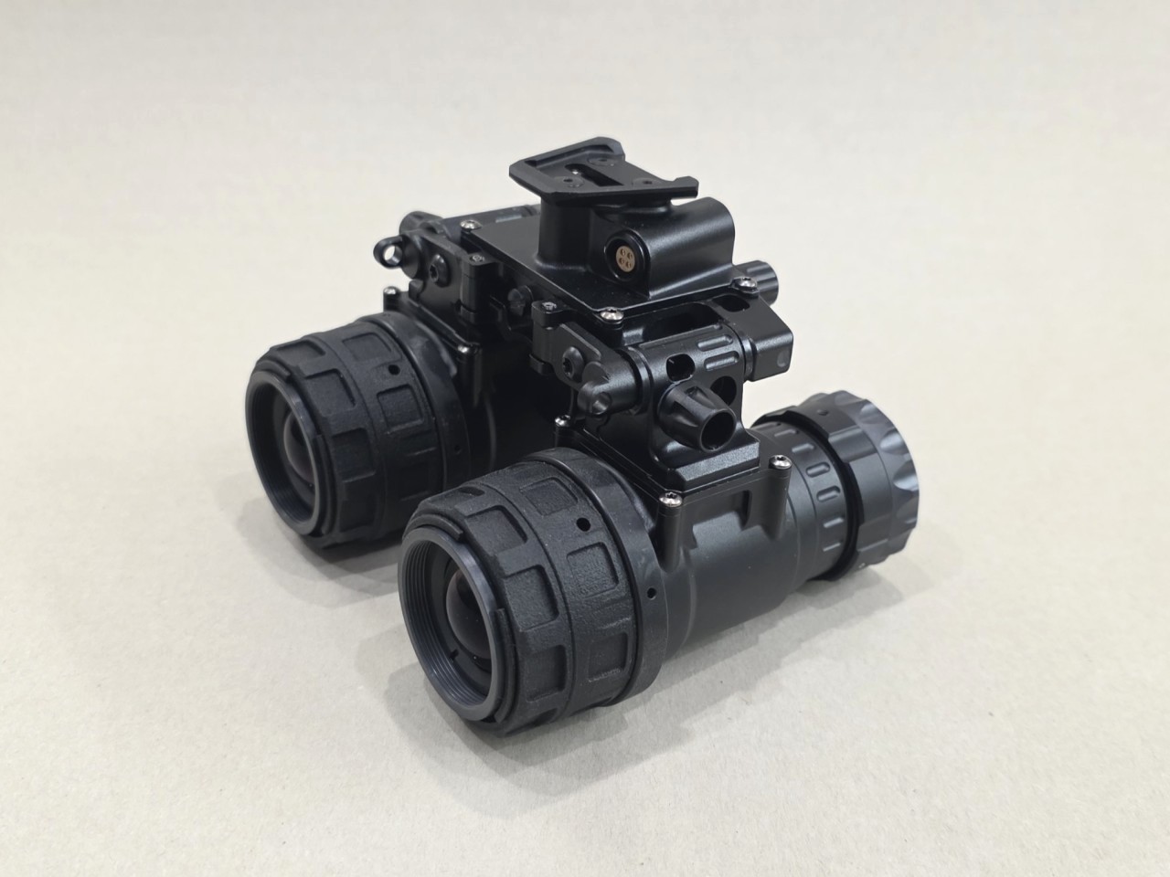 The Nighthawk-MG is a tough, feature packed device built to perform in harsh conditions. The housing is precision machined from 7075-T6 aircraft grade aluminum, ensuring durability in demanding environments. The binocular includes rotary controls for power and IR illuminator, along with a secondary dial for manual gain (brightness) adjustment of the image intensifier tubes. It operates on a single onboard CR123 battery or can utilize an external power source connected via a 4-pin LEMO-style plug. The binocular also features an interpupillary adjustment to fit a range of users comfortably. Its articulating design allows the optical pods to fold flat against the helmet when in the stowed position, reducing neck strain and protecting both the device and the user from potential impacts.